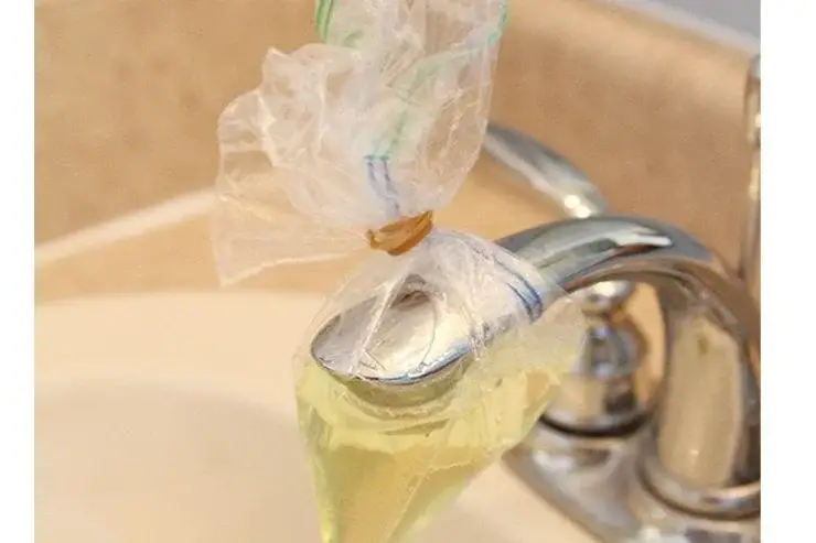 Dejar actuar toda la noche. Al día siguiente, desata la bolsa, frota con un cepillo de dientes para eliminar los residuos, luego abre el agua y déjala correr para liberar completamente el filtro.