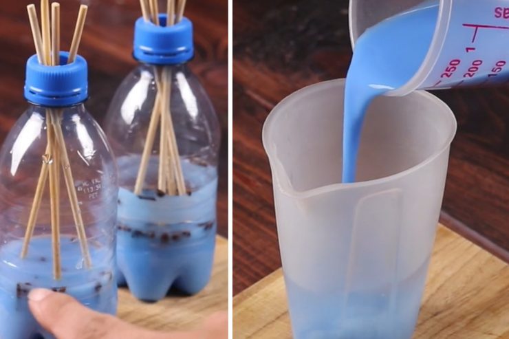 En este punto, todo lo que tienes que hacer es insertar 3 brochetas de madera en este agujero y mezclar la mezcla una vez más. De esta manera, el aroma de tu mezcla de bricolaje pasará a través de las brochetas de madera y podrá mantener alejados a los mosquitos, moscas y otros insectos. No olvides dar la vuelta a los palos de madera al menos una vez al día, para que la parte impregnada esté siempre en el exterior de la botella.